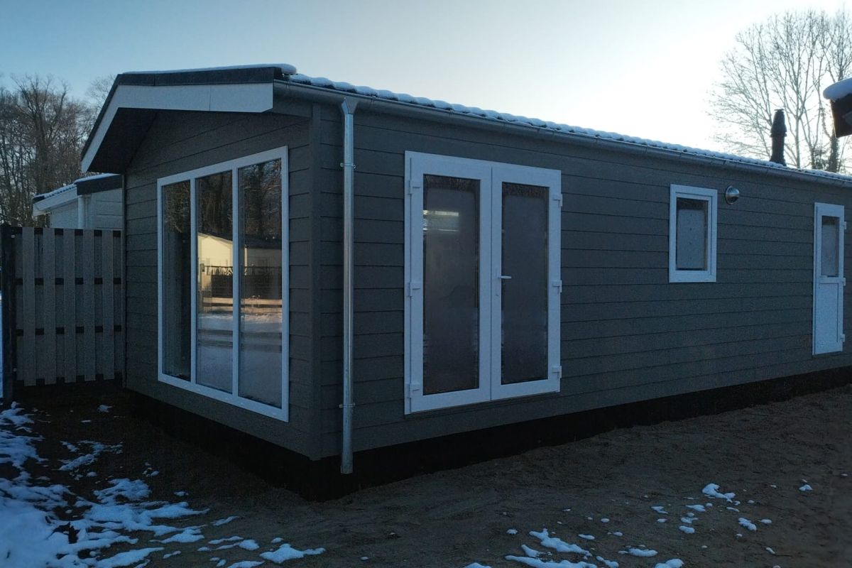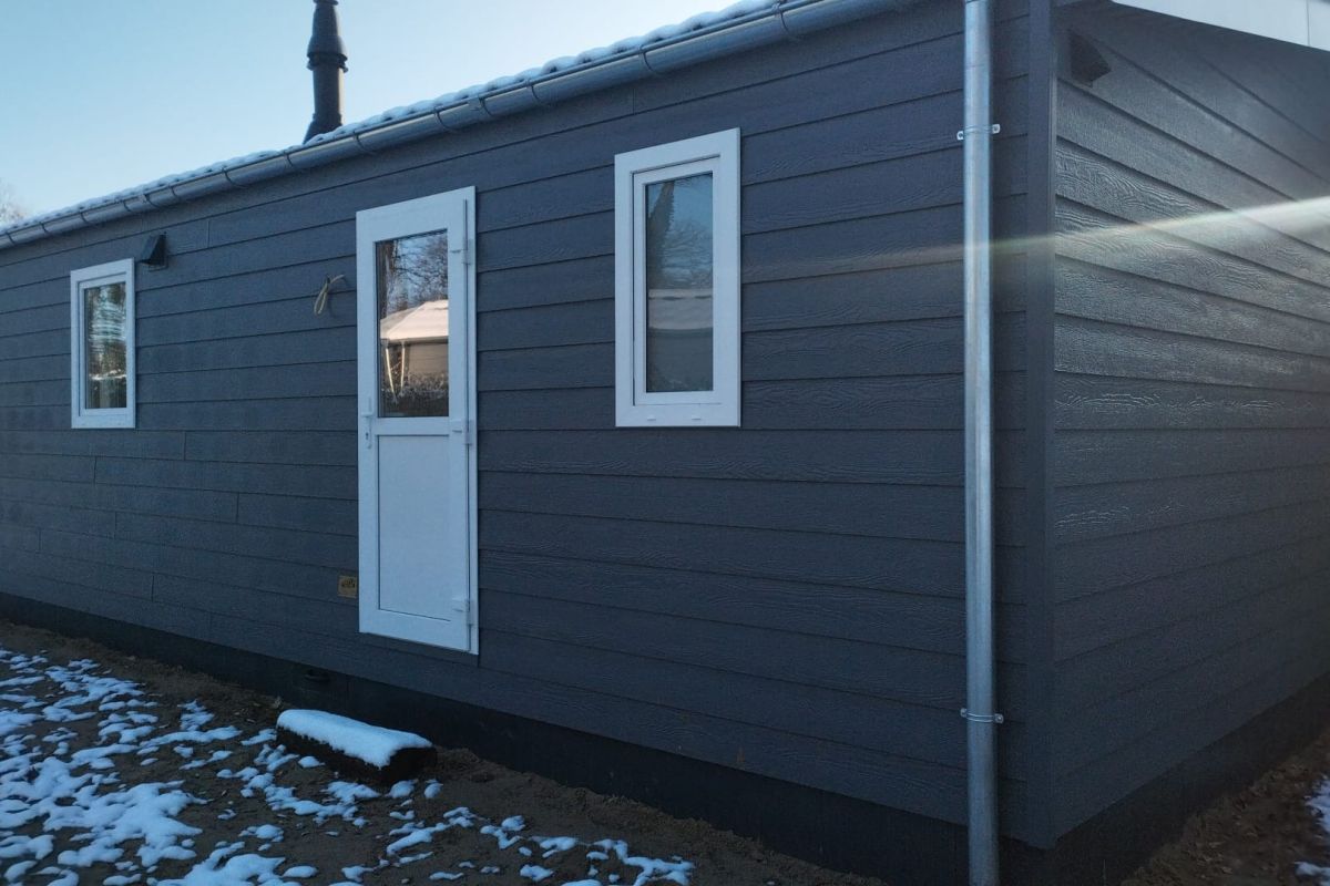 - Kunststof leigrijse buitenbekleding met witte kozijnen