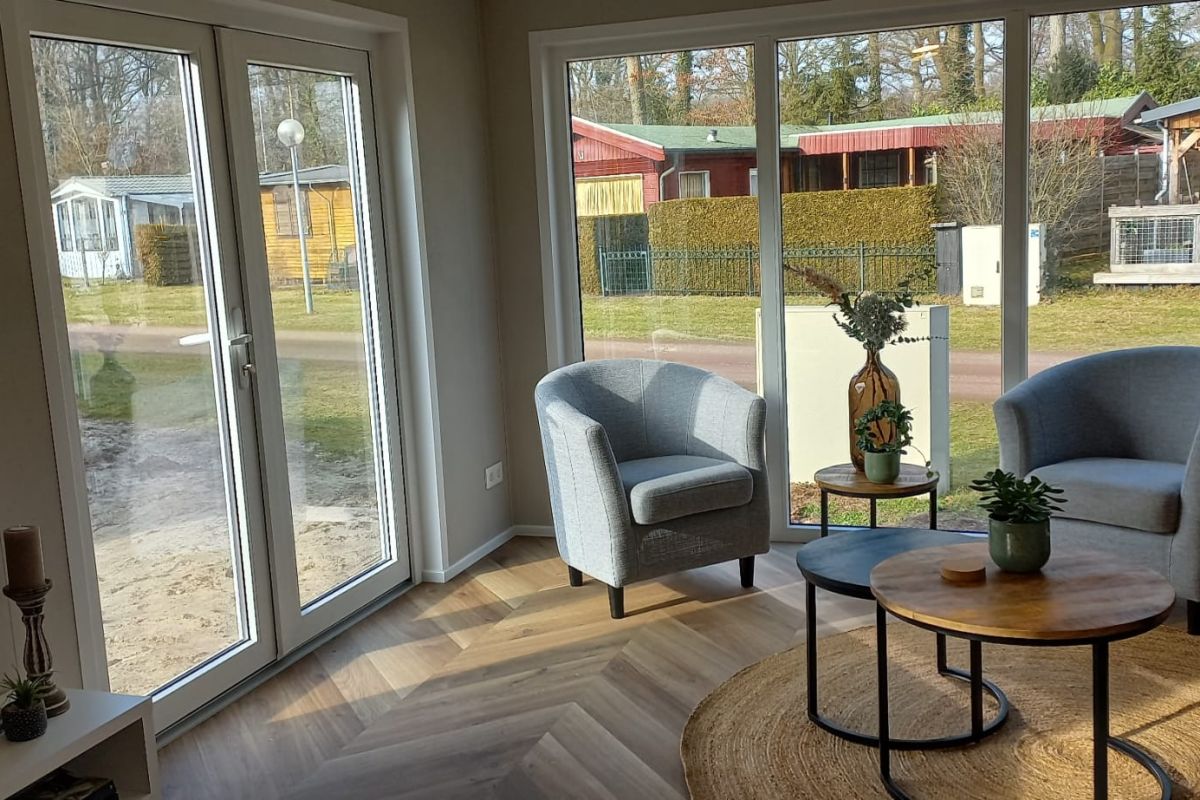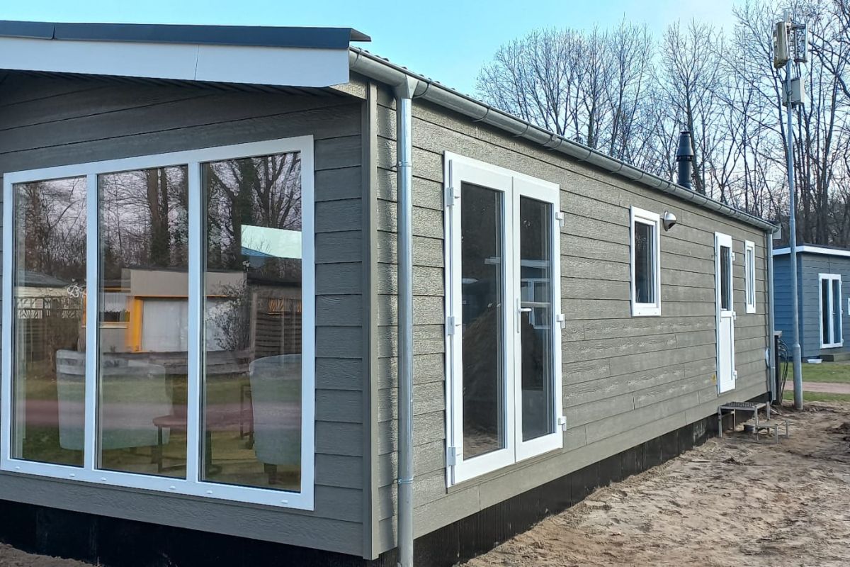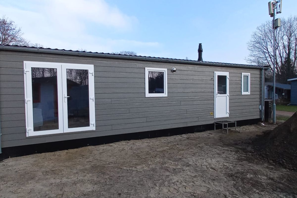 - Kunststof leigrijse buitenbekleding met witte kozijnen