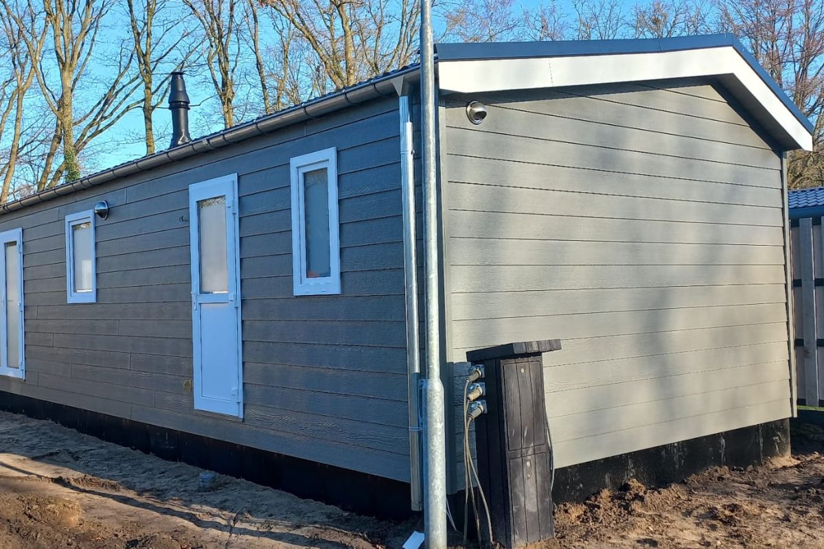 - Kunststof leigrijse buitenbekleding met witte kozijnen