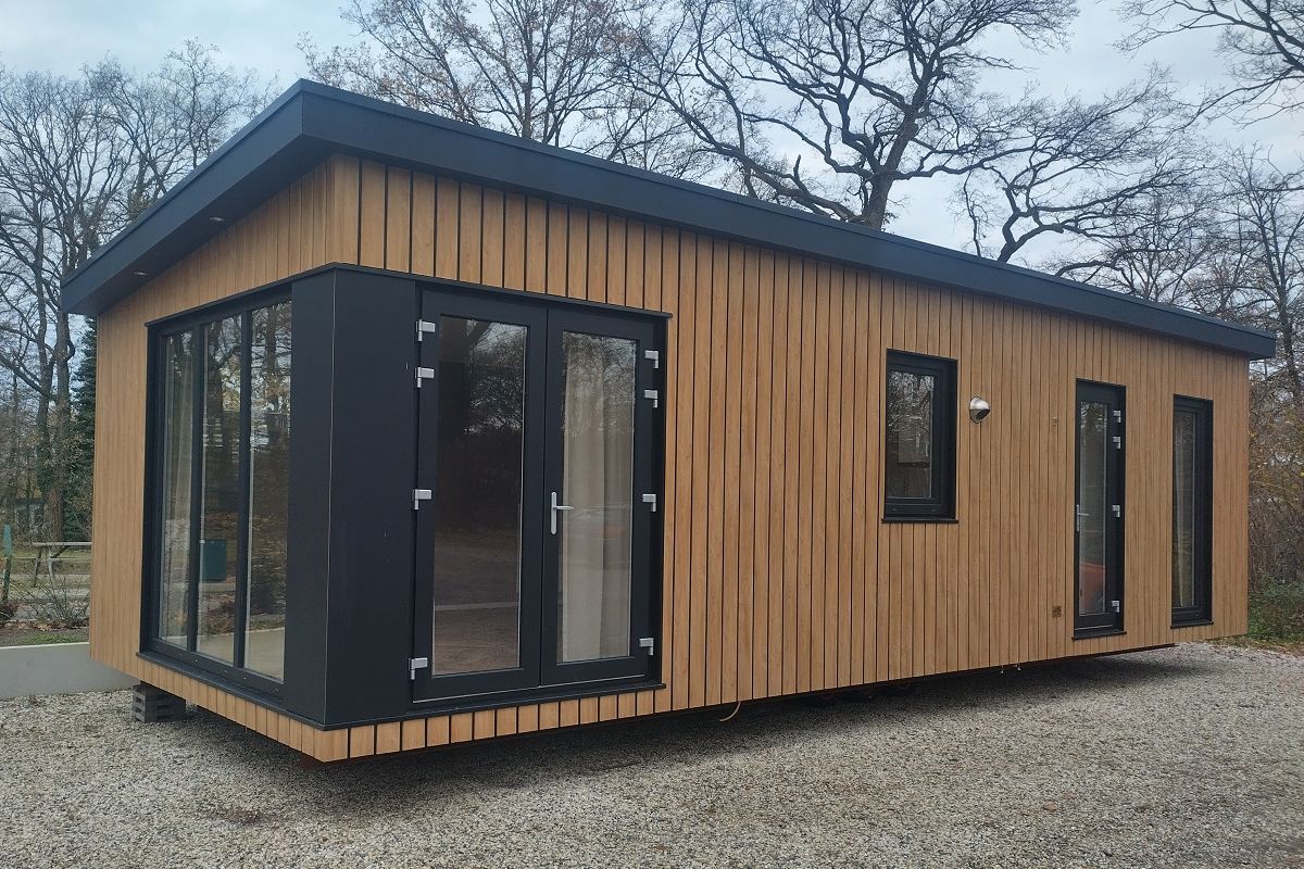- Kunststof houtlook buitenbekleding met zwarte kozijnen